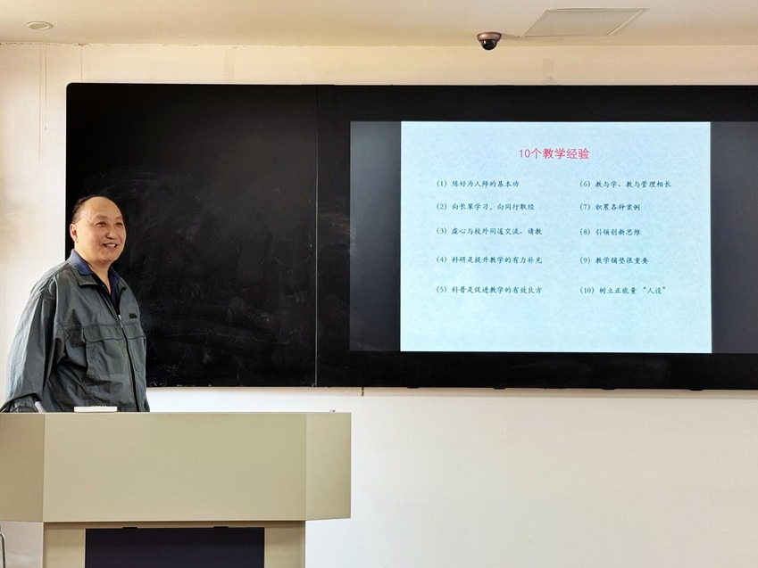 孙飙结合自身从教四十一年来的丰富经验,为全院教师带来了一场精彩纷呈的教学指导。他首先强调,教师要练好为人师表的基本功,做到“学高为师,身正为范”;其次要虚心向长辈学习,向同行取经,保持终身学习的态度;要主动与校外专家交流请教,拓宽教学视野。在教学方法方面,他指出,科研是提升教学的有力补充,教师要将最新研究成果融入课堂教学;同时要重视科普工作,将其作为促进教学的有效良方。他还强调,教师要注重积累教学案例,善于引导学生创新思维,做好教学铺垫工作,并在学生中树立积极向上的“人设”形象。最后,他寄语全院教师要继续发扬“融学训研求知信行”的优良院风,在教育教学工作中不断追求卓越。