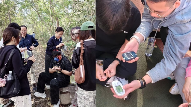 党支部结合运动人体科学专业特点,深入解读全会精神在教育科技人才一体化发展及健康中国战略中的意义。在实践环节中,教师党员带领同学们分为快走、跑步、爬山三个小组,以学校为中心,沿不同路线展开运动实践。一名同学佩戴便携式呼吸代谢监测系统K5,各小组配备运动手环、血糖、血乳酸便携式检测仪等专业设备,同学们在运动前、中、后等多个关键时间点,相互为同伴检测心率、血糖、血乳酸等生理生化指标,实时记录并分析数据动态变化,真正实现了课堂理论在真实运动场景中的验证与应用。