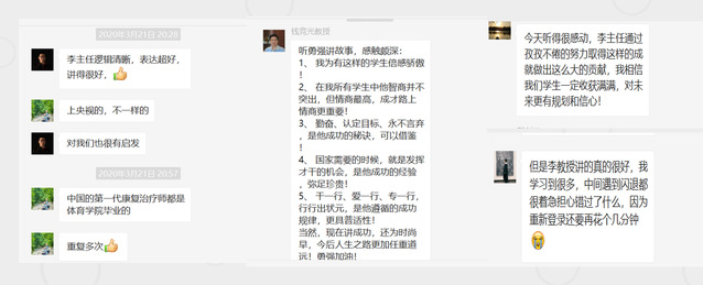 运动健康学院院长汤强代表学院表示感谢,并表示李勇强校友很好的阐释了初心的含义,对于学生来说,在求学阶段,初心就是要学会坚持,坚持人生目标、坚持学业发展,在工作之后,要学会奉献,懂得吃亏是福,给予才有收获;孙飙教授代表母校教师作了现场点评,希望大家认真学习和借鉴李勇强校友的奋斗精神,一是要有明确的目标并为之不断努力奋斗,二是要有顽强的越挫越勇的精神,有动力有想法有办法才有收获,三是全体学生要在疫情期间认真思考运动科学对于战“疫”的价值和意义,体育人任重道远,学会运动科学、研究运动科学,对于大家将来的职业就业、服务社会都有着重要的作用。