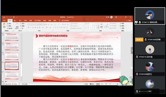 各团支部围绕“绽放战疫青春,坚定制度自信”的主题,通过线上主题团课帮助团员青年学习贯彻“十九届四中全会精神”,并进行讨论交流,引导团员青年增强“四个意识”、坚定“四个自信”、做到“两个维护”,将思想和行动统一到全会精神上来,坚定制度自信,担负时代使命。
