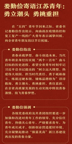 潮起海天阔,扬帆正当时。习近平总书记寄语广大青年,“青春由磨砺而出彩,人生因奋斗而升华。”省委书记娄勤俭寄语江苏青年,“勇立潮头、勇挑重担、勇往直前。”让我无比振奋、备受鼓舞,作为一名团员青年,定将珍惜韶华,不负青春,坚定理想信念,勇于创新创造,努力担起时代重任,用奋斗书写别样青春。
