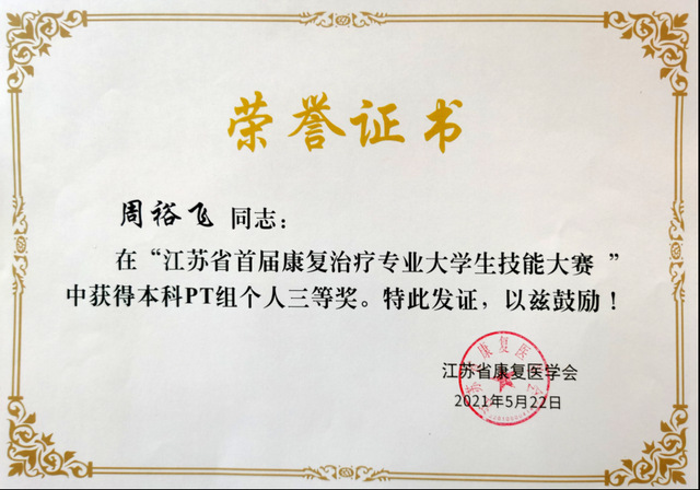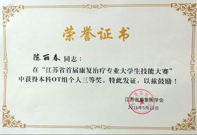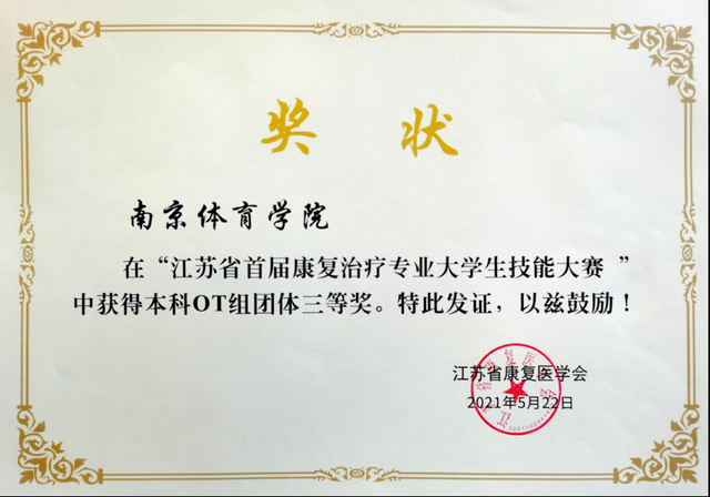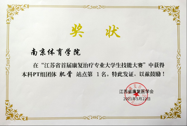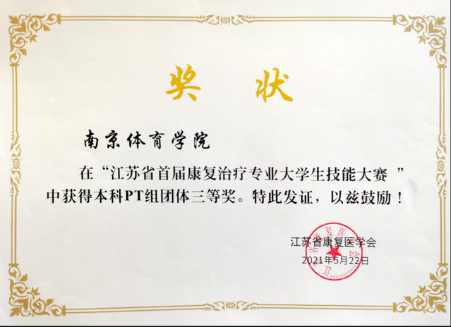 2021年5月20日至22日,由江苏省医学会和南京医科大学共同主办的江苏省首届康复治疗专业大学生技能大赛在江苏省连云港市南京医科大学康达学院举行。运动健康学院康复治疗学专业学生在大赛中取得突破,荣获1个一等奖,4个三等奖。