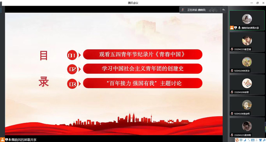 本次专题学习会议分为三个部分:一是观看五四青年节纪录片《青春中国》选段,结合历史影像,通过新时代不同行业青年人以青春报效祖国的故事,向全体学生展示一个蓬勃向上的青春中国;二是学习中国社会主义青年团的创建史,阐释了中国社会主义青年团的创建是中国共产党领导下的产物,是为实现民族复兴赤诚求索的必然结果,引导青年学生传承和发扬中国共产主义青年团的奋斗精神,增强“四个意识”,坚定“四个自信”,做到“两个维护”;三是开展“百年接力 强国有我”主题讨论,学生代表结合自身的学习生活实际,就如何充分发挥新时代青年在国家建设发展中的重要作用积极发言,大家纷纷表示作为新时代青年,将努力学好党的青年运动史,为学校的发展、为国家的强大奉献青春力量。