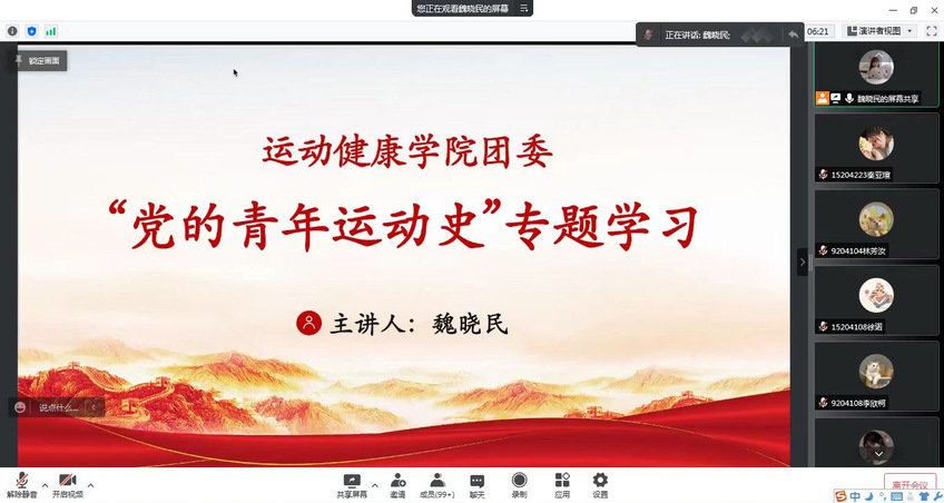 为喜迎党的二十大,庆祝中国共产主义青年团成立100周年,运动健康学院团委于4月27日下午,通过腾讯会议平台,组织学院全体学生开展“党的青年运动史”专题学习活动,进一步加强对团员青年的思想政治引领,团结引领广大团员青年永远跟党走、奋进新征程。活动由运动健康学院团委副书记魏晓民主持。